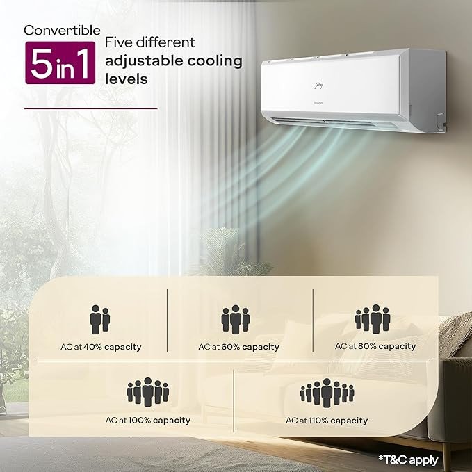 5-in-1 Convertible Split AC with inverter compressor: Variable speed compressor which adjusts power depending on heat load. Operates at a cooling capacity ranging from 40% to 110%, adjust cooling capacity at your convenience thus helps in saving energy.