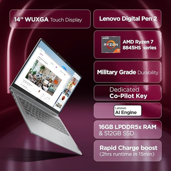 Lenovo Ideapad 5 2-in-1 AMD Ryzen 7 8845HS 14" (35.5cm) WUXGA IPS 300Nits Convertible Laptop (16GB/512GB SSD/Win 11/Office Home 2024/Backlit KB/FPR/FHD Camera/Grey/1.6kg), 83DR003BIN