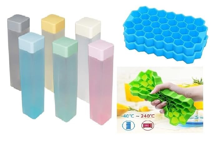• Combo pack of high-quality plastic wahter bottles ( Set of 6, Each 1000ml Multi-Colour) and Silicone ice cube trays 2 pcs