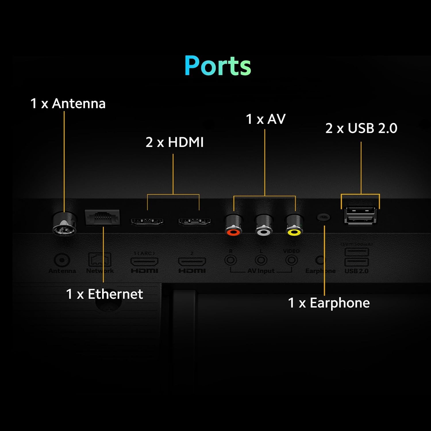 Connectivity: Dual Band Wi-Fi (2.4 GHz/ 5 GHz) | 2 HDMI ports to connect set top box, gaming consoles, DVD or Blu-ray Players | 2 USB ports to connect hard drives and other USB devices | ARC | Bluetooth 5.0 | Ethernet | 3.5mm earphone Jack