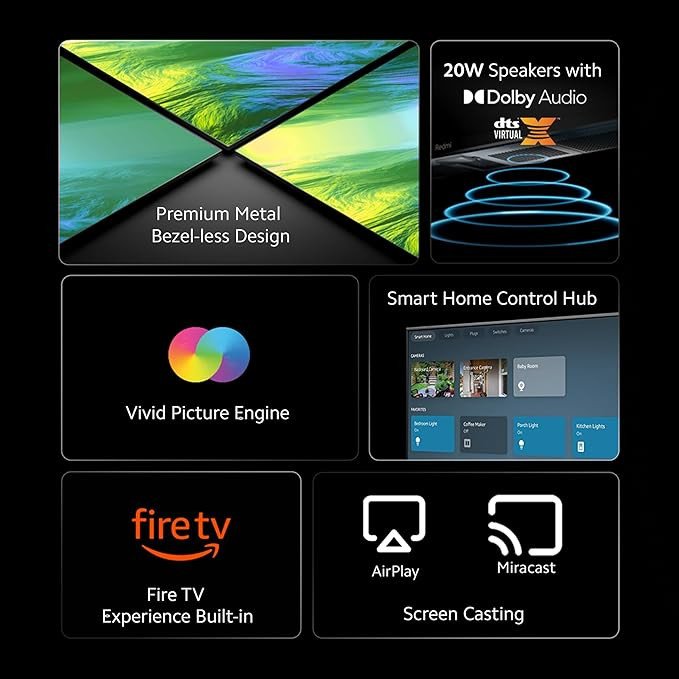 Fire OS 7 | Supported Apps: Prime Video | Netflix | 12000+ apps from App Store | Voice Remote with Alexa | DTH Set-Top Box Integration to switch between DTH TV Channels and OTT apps from home screen | Display Mirroring - Airplay and MiracastFire OS 7 | Supported Apps: Prime Video | Netflix | 12000+ apps from App Store | Voice Remote with Alexa | DTH Set-Top Box Integration to switch between DTH TV Channels and OTT apps from home screen |…See more