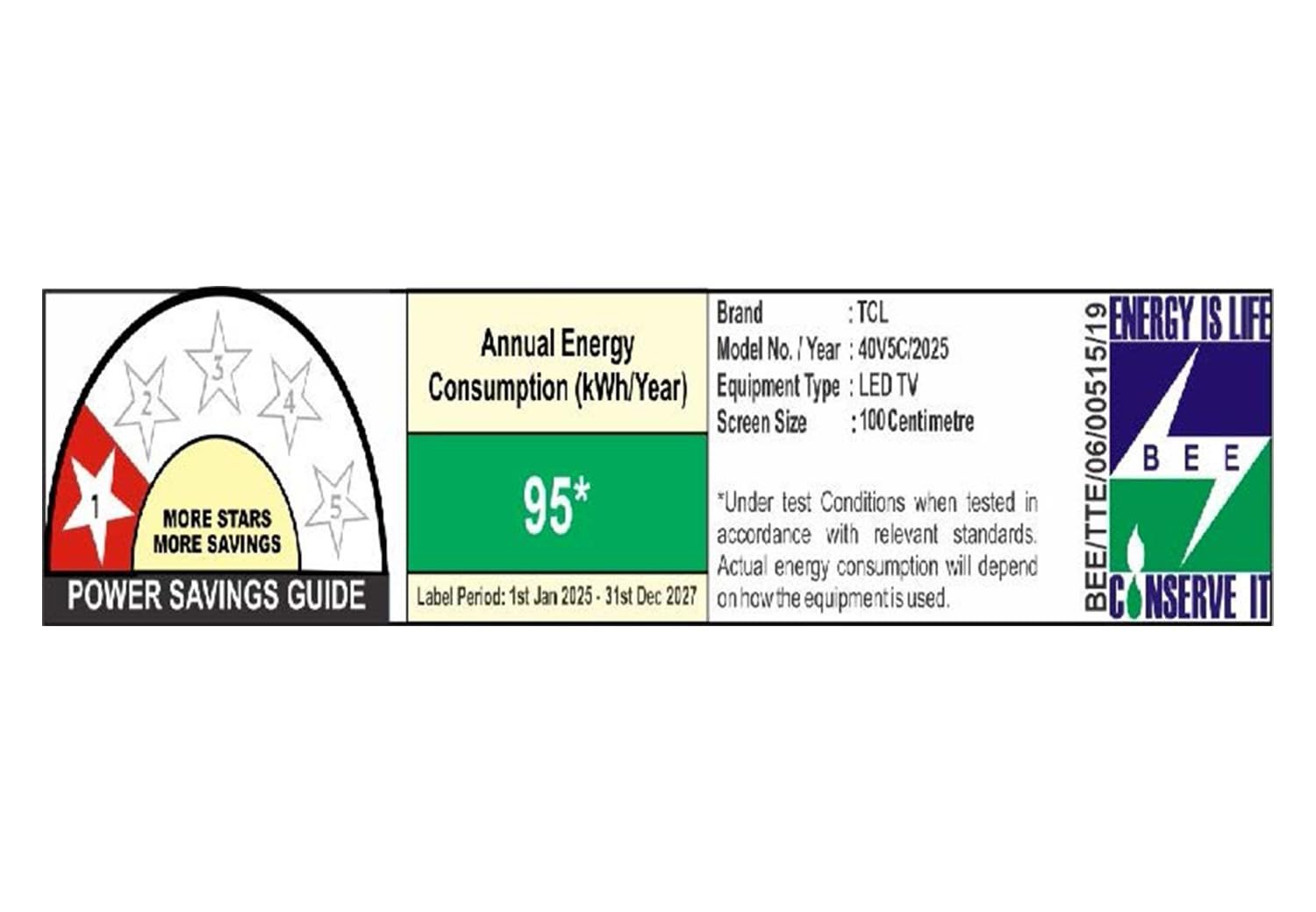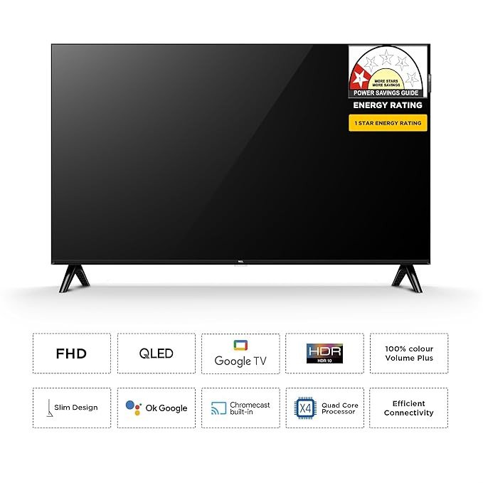 Smart TV Features: FHD QLED Google TV |1GB RAM | 8 GB ROM | 64-bit Quad Core Processor| Wi-Fi 4 | Google Assistant |Prime Video, Netflix, Hotstar, Zee5 and more| Web Browser | Screen Mirroring| Energy Rating: 1 Star | Annual Energy Consumption: 95 kWh