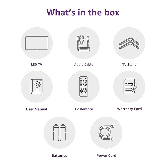1 N LEDTV, 1N Audio Cable, 1N Stand 1 N User Manual, 1N Remote, 1N Warranty Card, 2 N Batteries, 1N Power Cord1 N LEDTV, 1N Audio Cable, 1N Stand 1 N User Manual, 1N Remote, 1N Warranty Card, 2 N Batteries, 1N Power Cord